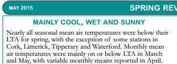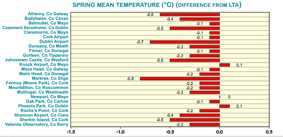 This means that Spring 2016 was colder than the average for 1981-2010 (LTA). This was the period which scientists warned us that the Earth was warming up like never before. So now Ireland is bucking the trend.