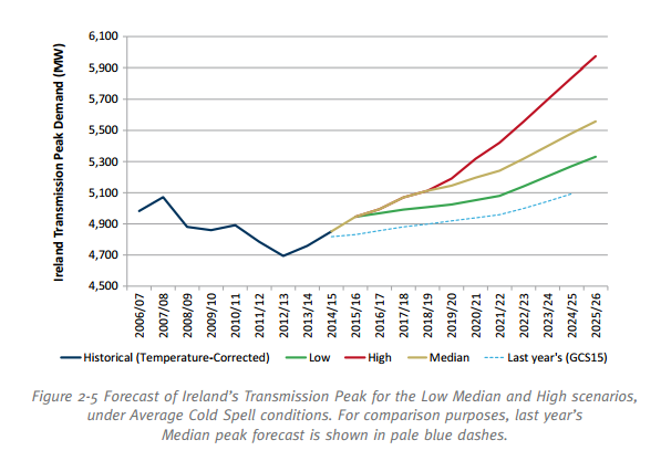 This report does not include changes in the generating mix since large scale deployment of wind energy. For example, off grid diesel generation capacity (known as Demand Side Units) now stands at 230MW, a 40% increase on the previous year [16]. There was a 6% increase in oil consumption at Ireland’s power stations between 2013 and 2015 [17].